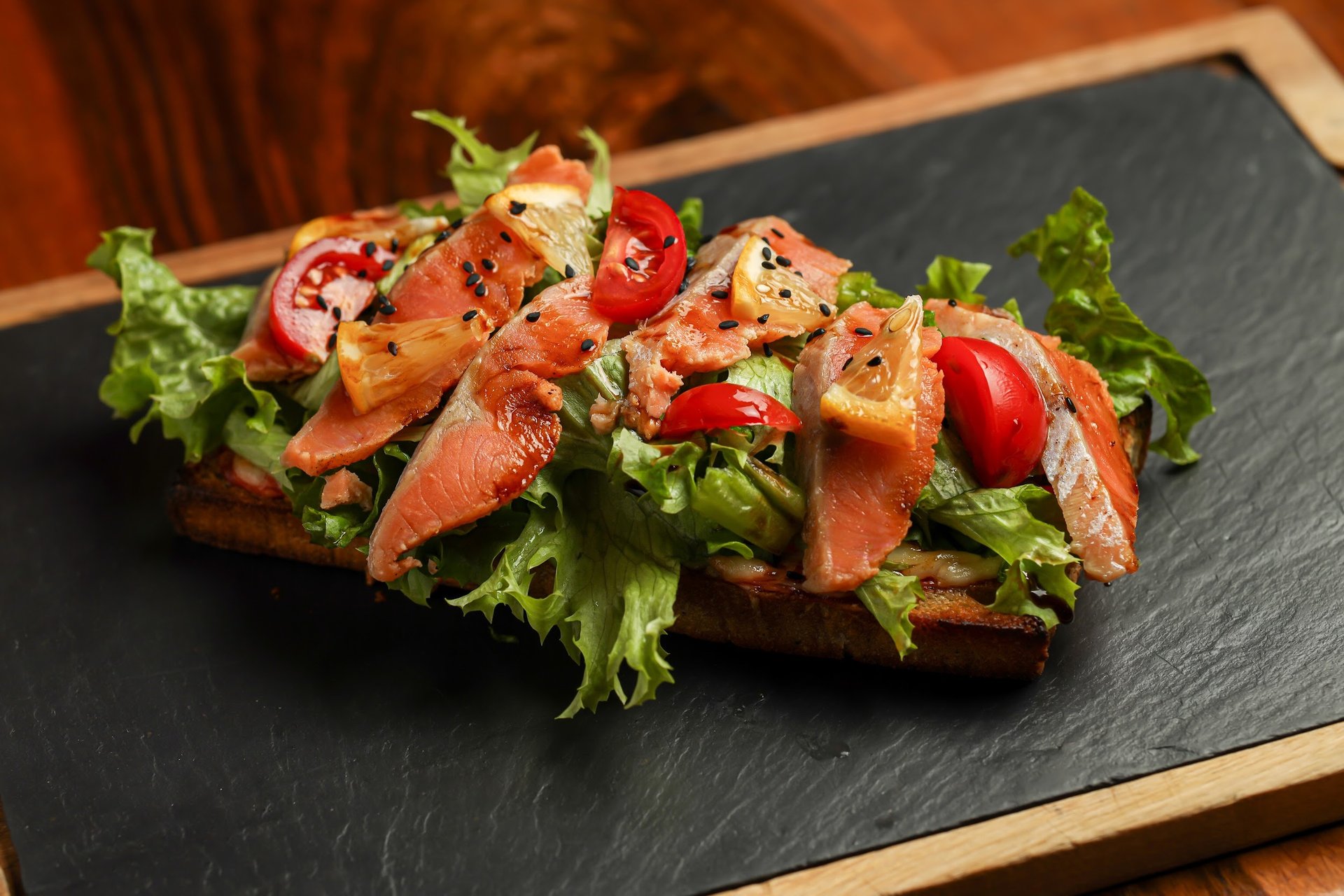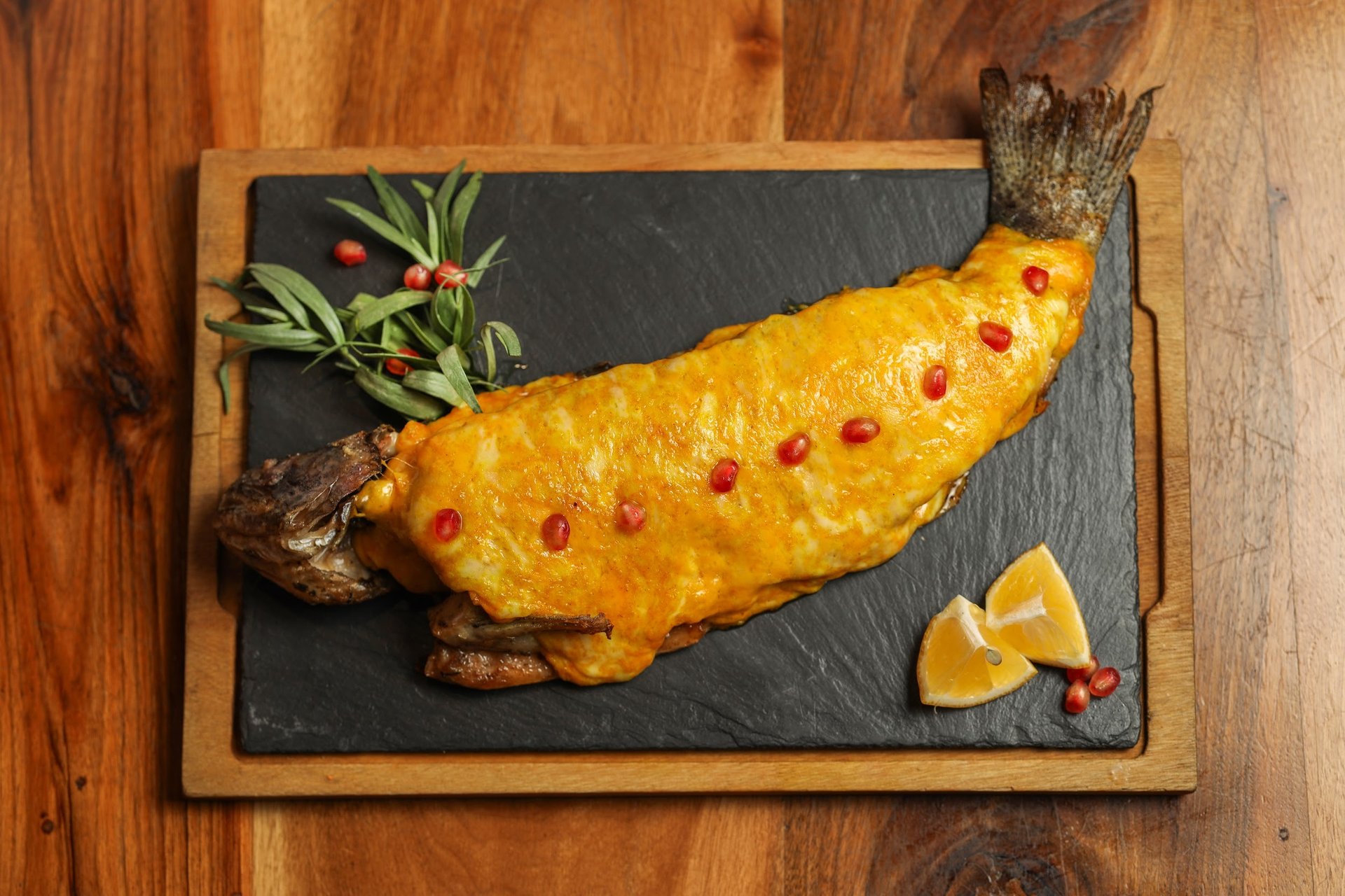 oven-baked seasoned whole Ishkhan trout, mushrooms, green pepper, onion, tomato, tarragon, cheese mix, lemon