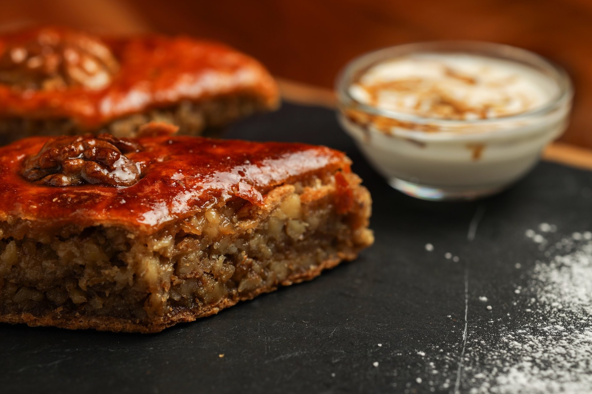 walnuts and sauce of honey, molasses, strained matsun, and sour cream